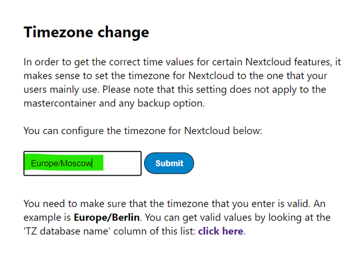 Все почти готово, остались последние настройки, на загрузившейся странице нужно в первую очередь внизу задать временную зону, в моем случае это «Europe/Moscow». Также можно выбрать зону по ссылке под полем для ввода.