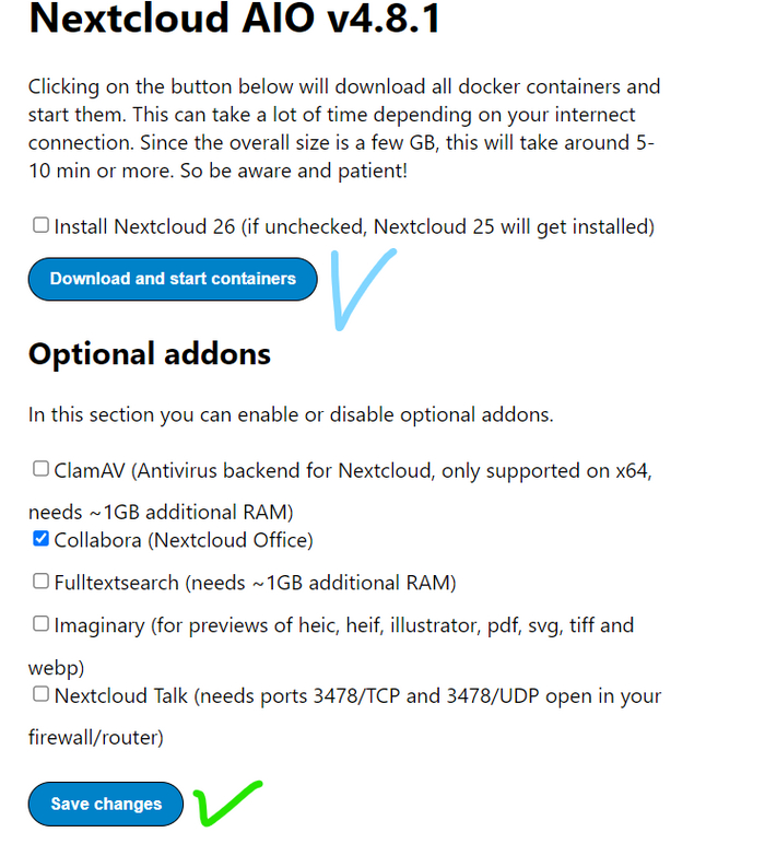 Далее нажимаем «Download and start containers» (голубая галочка). В данном случае установщик предлагает установить версию 26, а не 25. На момент прочтения версия может быть уже 27 или даже выше, ставим соответственно самую последнюю.