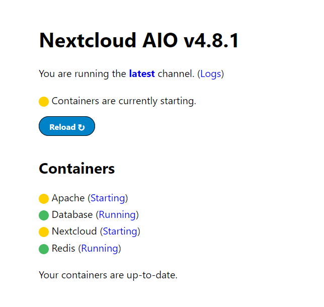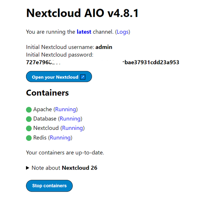 вам не нужно париться из-за установки баз данных, контролировать версию PHP и потом самостоятельно обновлять это достаточно не френдли-юзер способом. При установке через Docker нужно лишь перейти на отдельную страницу, обновить контейнеры с ПО парой кликов и все эти зависимости и связи подтянутся автоматически и вы всегда будете иметь актуальную версию всего окружения для работы облака. На этой же отдельной вкладке есть встроенные средства для бекапа, что надо отметить немаловажно использовать при обновлении.