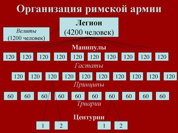 Основной тактической единицей римской армии был легион. Боевой порядок легиона строился в три линии по 10 манипул в каждой. Первая линия – гастаты, молодые воины (1200 бойцов), вторая – принципы, воины в расцвете сил (также 1200 человек), третья – триарии – ветераны (600 бойцов). Впереди легиона, вне манипулярного строя, располагались велиты – легковооруженные воины (1200 человек), названные так по имени легких метательных копий. Каждый воин имел 5-7 таких копий.