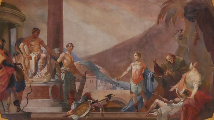 Некоторое время ряды иберов и кельтов выдерживали бой и храбро сражались с римлянами; но затем, под давлением тяжелой массы легионов, они подались и начали отступать назад, изгибая линию полумесяца в противоположном направлении. Фактически, у карфагенян фланги и центр вступили в битву не одновременно, центр раньше флангов, поскольку кельты, выстроенные в виде полумесяца, выпуклой стороной, обращенной к неприятелю, выступали далеко вперед.
