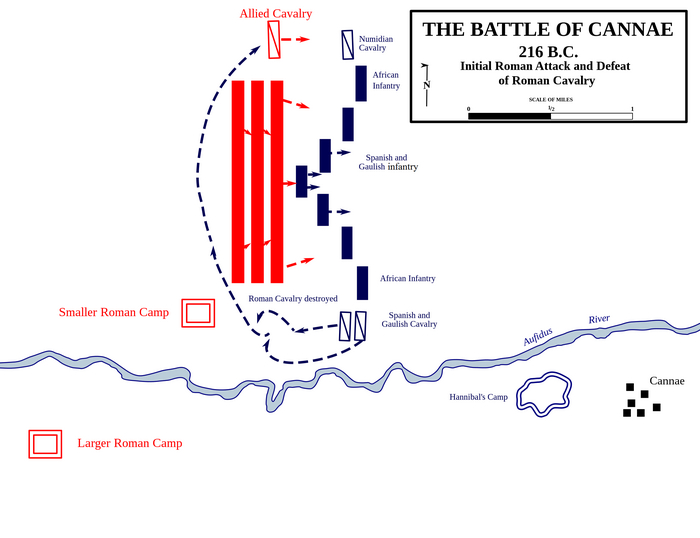 То есть, карфагенская кавалерия имела подавляющее количественное и качественное превосходство над римской конницей. И этим преимуществом римский командующий Теренций Варрон пренебрег. Мой просвещенный читатель, наверное, прекрасно понимает огромное значение конницы в войнах Древнего мира.
