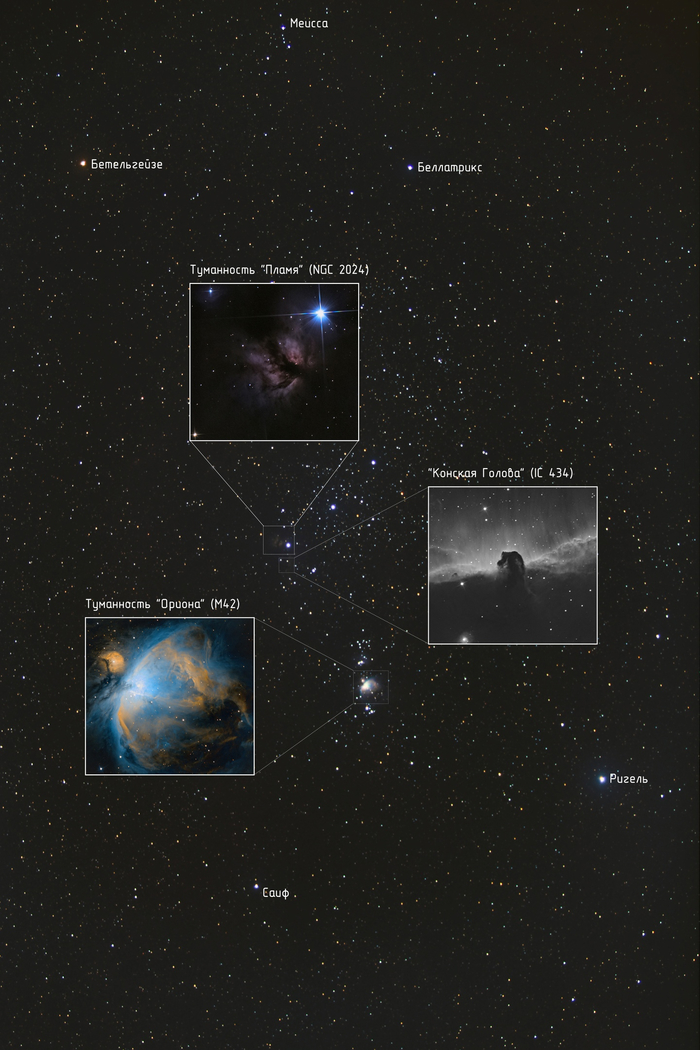 А вот на это изображение я добавил фотографии туманностей, которые уже были получены телескопом на самодельной обсерватории. Эти туманности достаточно тусклые, поэтому они снимались через узкополосные фильтры (кроме NGC 2024, она была снята также на зеркальный фотоаппарат но уже через телескоп).