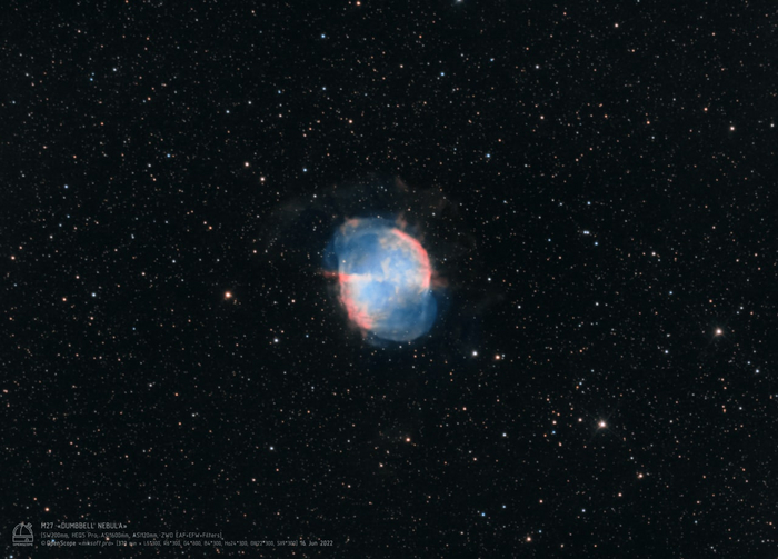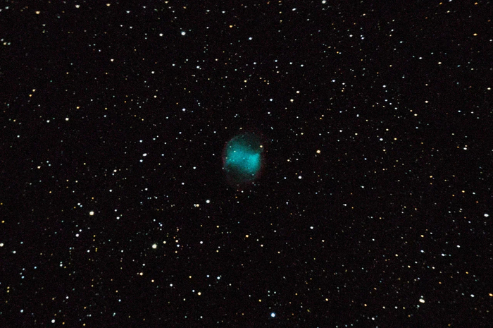 Все фотографии делались только для пробы, прошло уже 6 лет, и вот например как сейчас получается туманность "Гантель", эти фотографии делаются с большой выдержкой автоматически в самодельной обсерватории: