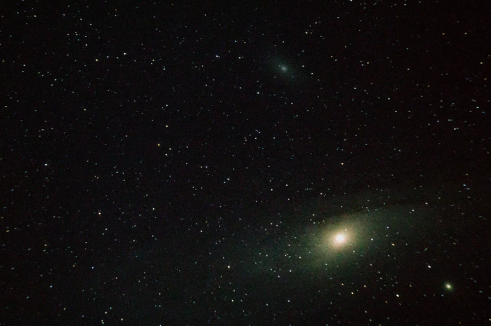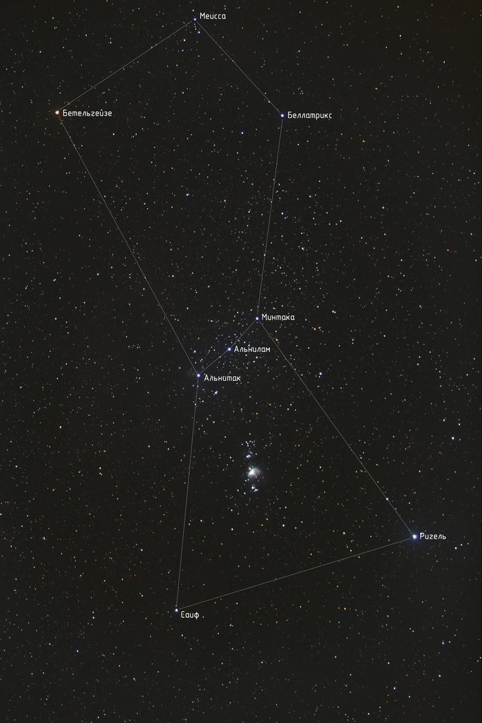 И посмотрите: на фотографии, сделанной на зеркальную камеру, проявляется цвет туманностей (Пламя и Туманность Ориона).