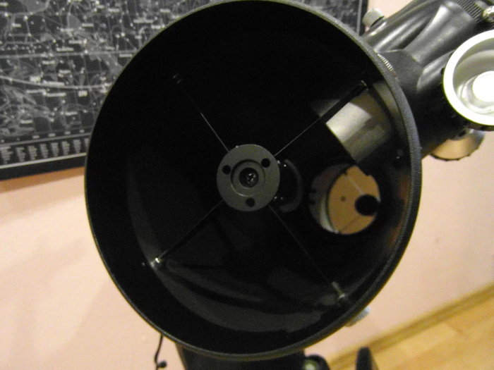 Это кольцо накручивается на "тушку" фотоаппарата, и уже сам фотоаппарат накручивается вместо окуляра на фокусировочный узел телескопа. Получается что сам телескоп является огромным объективом для фотоаппарата. Возникла новая проблема - никак не удавалось настроить фокус на фотоаппарате - не хватало ходу фокусера. Проблема решаема, вытащил главное зеркало телескопа (заодно и помыл):