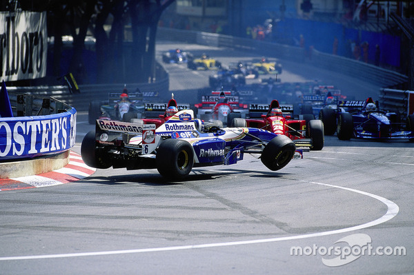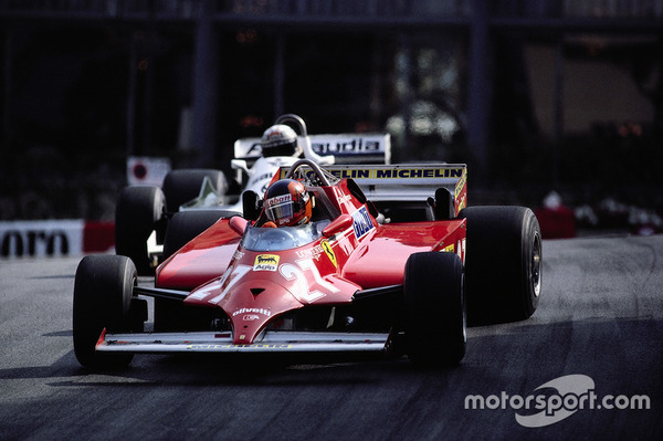 Гонщик Ferrari Жиль Вильнёв отбирает лидерство в гонке у пилота Williams Алана Джонса за 4 круга до финиша Гран При Монако-1981