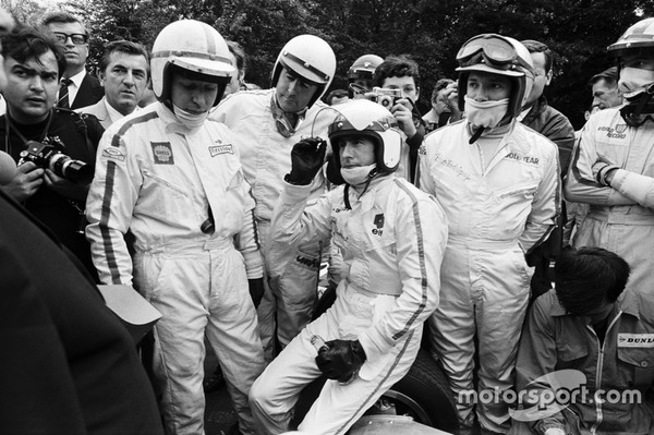 Грэм Хилл готовится к старту в окружении своей семьи: жены Бетт и няни, приглядывающей за тремя его детьми. Спереди справа – будущий чемпион мира Дэймон Хилл