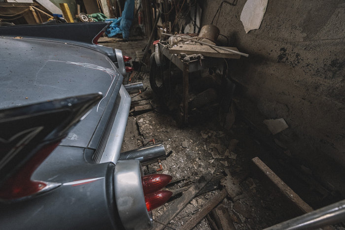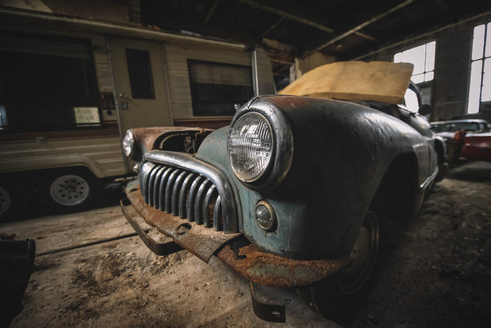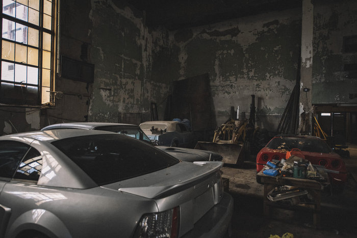 В углу пылится кабриолет Oldsmobile Cutlass 1967 года, рядом с ним — полуразобранный Chevrolet Corvette C4 красного цвета и Chevrolet 210 1957 года.