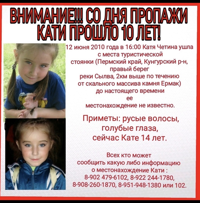 Девочка из Перми Катя Четина пропала без следа 10лет назад. Просим помощи в распространении и просим огласки!