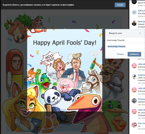Проще говоря, кнопку, которая появляется на вашей странице, просто напросто вставили в другое место с чужим фото, и что самое интересное, защиты от этого никакой нет и это сработало! Сейчас вы лицезреете пост Павла Дурова, на котором я могу отмечать кого угодно!