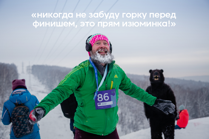 На трейле можно было выбрать два вида дистанции. 10 км для отмороженных смельчаков и 20 км для самых отмороженных смельчаков. Но одной храбрости участников недостаточно, чтобы быть уверенными в безопасности гонки. Поэтому на трассе было несколько пунктов обогрева, дежурные спасатели, скорая и медведь, обнимающий, своими теплыми лапами замёрзших финишеров. При этом замёрзли далеко не все: часть атлетов прибегали красные и мокрые, как будто только вышли из бани.