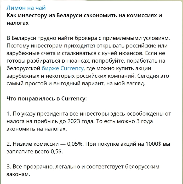 Биржа Currency. com - это проект известного белорусского IT предпринимателя Виктора Прокопени. Она была запущена в 2018 г. после принятия знаменитого декрета президента Республики Беларусь №8 “О развитии цифровой экономики”. Сайт проекта дает нам следующее определение: “Currency.com - это первая в мире регулируемая биржа токенизированных криптоактивов, где можно инвестировать в традиционные финансовые рынки быстро и прозрачно”. Если простым языком - сервис дает нам возможность покупать токены, стоимость которых привязана к стоимости тех или иных ценных бумаг. Глобально я против этой идеи ничего не имею - кому-то, возможно, будет интересно.
