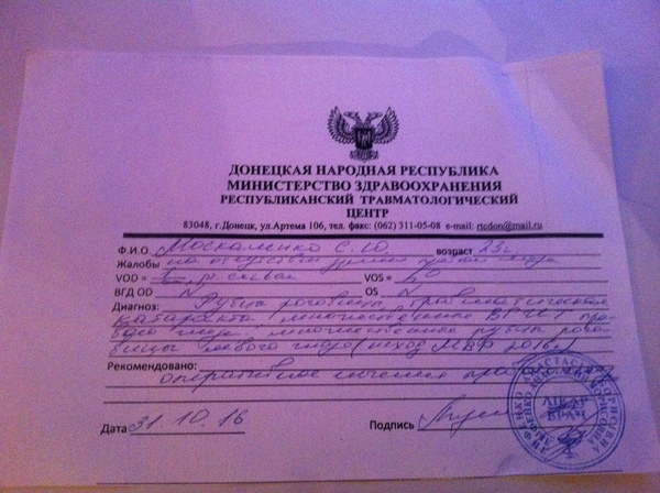 Почему не в Донецке: потому что в Донецке не могут вытащить осколки, хрусталик заменить могут, а вот вытащить осколки - нет, а одно без другого смысла не имеет. Он мне говорил, что осколки близко к нерву расположены, и т. д., но я не врач, поэтому особо не вдавался.