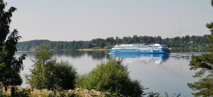 Зато виды чумовые, река здесь широкая, судоходство развито, мимо нас прошел большой туристический теплоход, видимо кто-то отправился в круиз. На другом берегу находится поселок Волга, но нам туда не надо, по плану город Мышкин. Едем до парома.