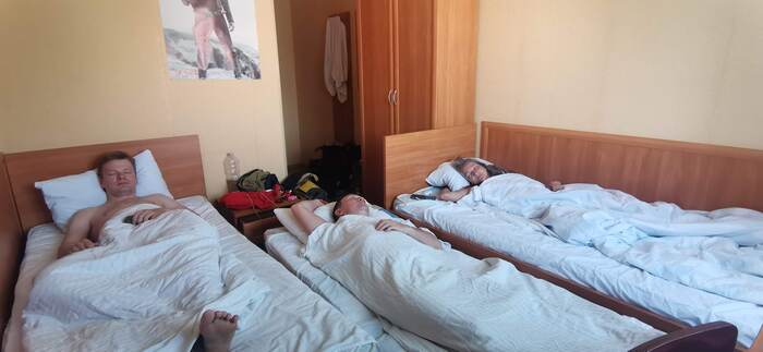 Доехали минут за 30, гостиница была как на картинке, велики поставили в холле, а за дополнительные 500 рублей нам принесли раскладушку. Так что в компактном двухместном номере поместились три туриста. По комфорту это лучше палатки, тем более горячий душ и завтрак включены в стоимость проживания.