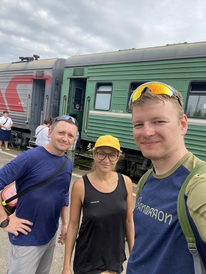 День выезда, утро раннее, Ярославский вокзал, поезд в 7, значит встать надо было в 5. Ладно, дело-то важное. Я приехал первый, покрутился на площади перед всеми вокзалами, скоро приехала Аня, загорелая путешественница, с белыми зубами и голубыми глазами. Чуть позже стрелой прилетел Саша на скоростном гравеле. Поезд типа Ласточка, идет быстро, велики можно перевозить не разобранными, для этого нам выделили весь задний тамбур. 13 вагон, сидячий. Хороший поезд, пара остановок, три с небольшим часа, и мы в Ярославле. По пути перекусили и выпили кофе.