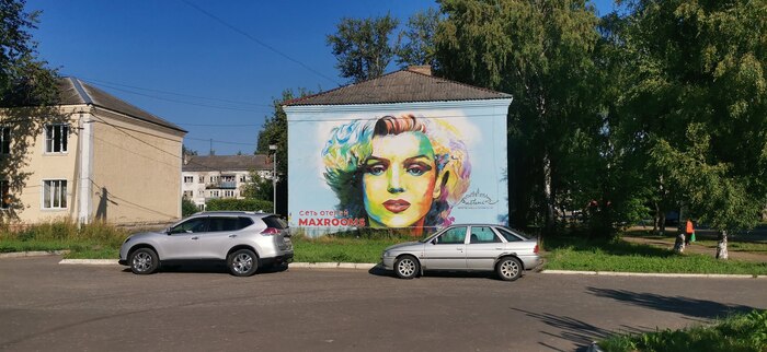 Рыбинск городок интересный и красивый, мы в этом убедились еще выйдя из отеля, на стене какого-то гаража было граффити Мэрилин, той самой. А напротив, за деревом спрятался неизвестный дядька Роберт Шенк. Гугл подсказал, что это… основатель Голливуда. И он родился в Рыбинске. Вот так да!
