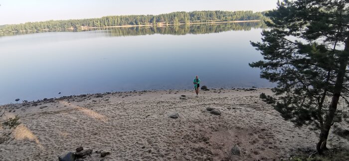 Как нам повезло, ох как. Сначала мы чуть не залезли в грязь, но потом проехали через дачи и оказали на берегу Волги. Справа и слева места заняты, но от нас люди довольно далеко. Отличный пляж, высокий берег со ступеньками к воде, сосны, кострище и даже куча дров. Кто-то здесь отдыхал до нас. Мусора нет, и мы тоже ничего не оставили после себя.