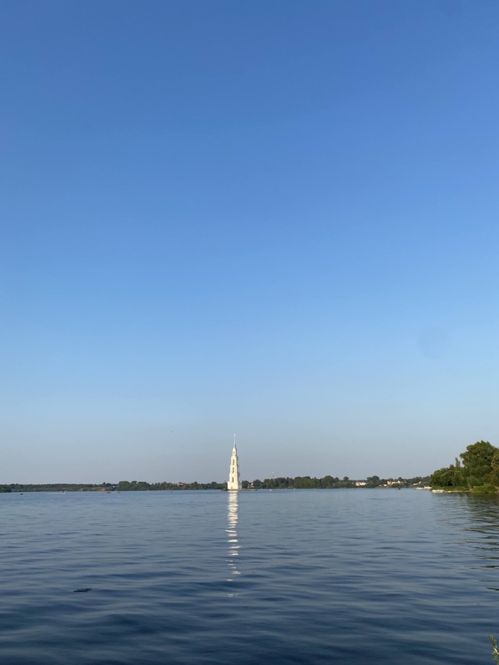 Что делать в Калязине, смотреть на церковь в воде и купаться. Мы совместили оба занятия. Пляжик довольно скромный, видно, что начали ремонт, стоят столбы, залит бетон под дорожки. Водичка нормальная. По реке ходят туристические суда, яхты.