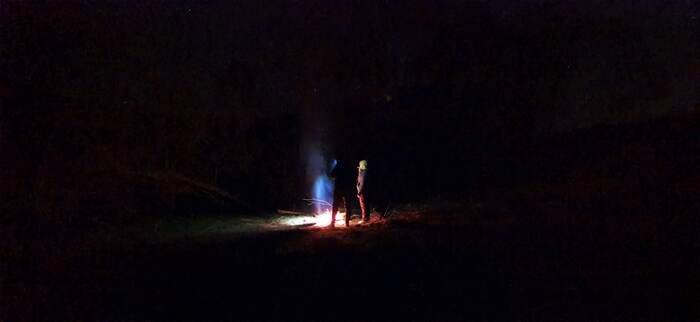 Ставим лагерь, жгем костер. Сегодня будет теплее, до воды далеко, она внизу, ветра нет. Кайфуем до 11 вечера. На ужин лапша и сосиски. Чай, конфеты, печенье. Немного алкоголя.