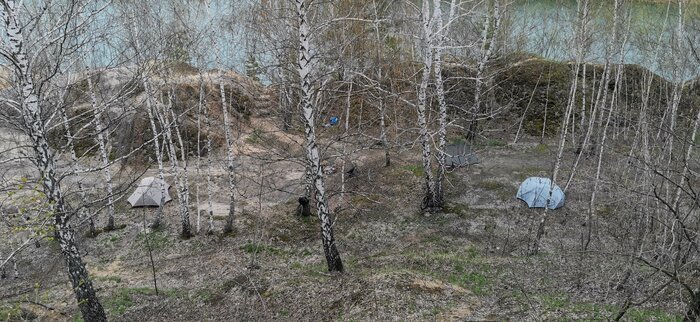 Ура, приехали, 45 километров в пути. Ищем место, плутаем, встречные гуляки подсказали хорошее место, даже с туалетом. Совсем близко. Вроде норм, но надо еще посмотреть. Дальше хуже. Помойки, обрывистый берег и много соседей по обеим сторонам озера. Вернулись, Аня нашли еще более тихое место, идеально, просто так не зайдешь, с одной стороны холмы, с другой горочка и спуск к воде. Только дров нет. Понятно, туристы тут с апреля по октябрь, сожгли всё. Чудом я нашел поваленное сухое дерево, вот и пригодилась пила!