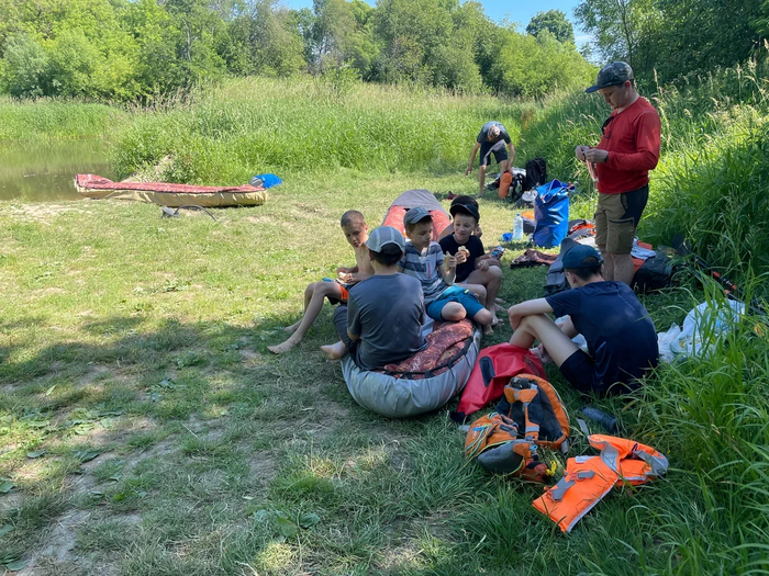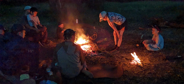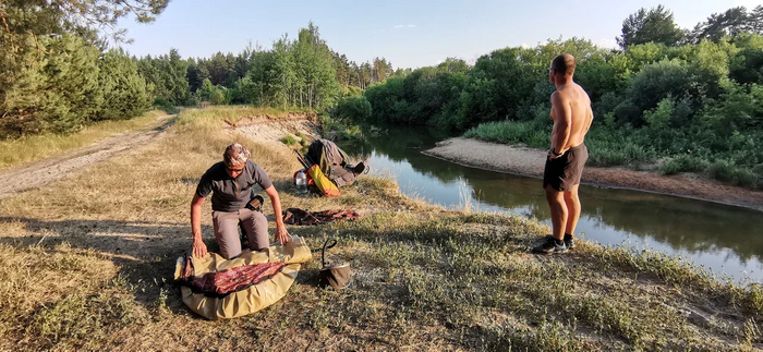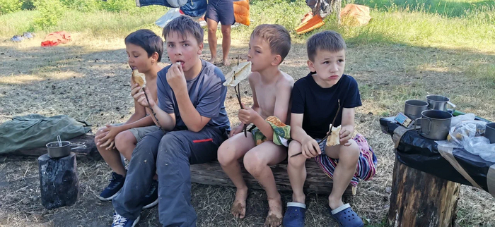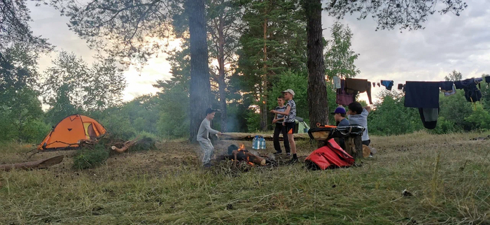 Палатки, костер, несколько мелких детских костров. Все безопасно, дети опытные, не первый раз в походе. Сосиски, тушенка, гречка, шоколад, чай. Вкуснятина.