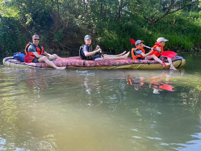 Быстренько накачали байдарки, ну и колбаса. Больше 5 метров длиной. На одной байдарке папа и три ребенка, на второй два папы и три ребенка. Гребли папы и старший сын Федор. Мелкие дети подгребали.