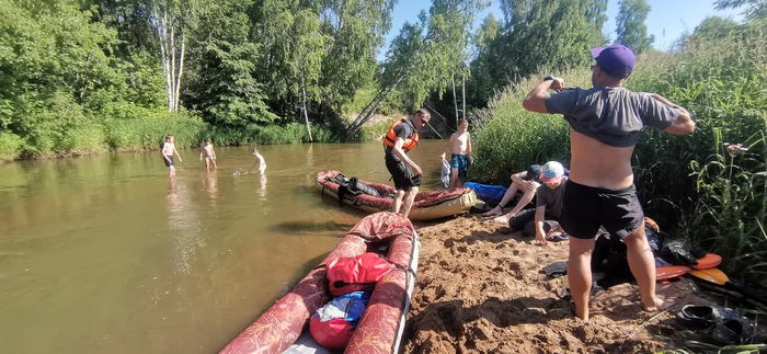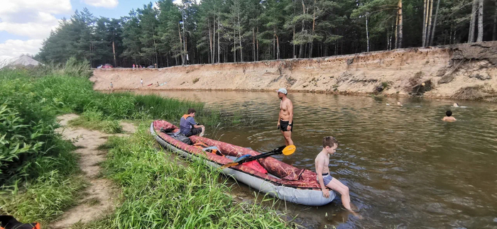 В самом начале наша байдарка ушла вперед, а второй не было видно довольно долго. Оказывается она немного сдувалась, о чем нам сказали проплывавшие мимо туристы. Вот так да, Кирилл пошел обратно по берегу, борясь с крапивой, спасать команду. Через 30 минут всё поправили и пошли по реке вниз.