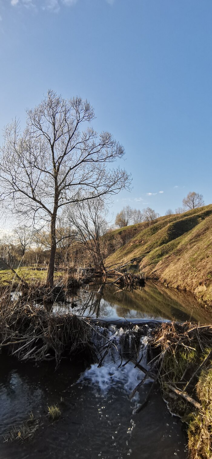 Речка Тетяковка в этом месте небольшая, а дальше она вливается в Пронское водохранилище. Летом может быть до него доедем. На реке множество бобровых плотин и десятки поваленных толстых деревьев. Также здесь много плавниковых дров, кучу, на 4 часа костра, натаскали минут за 15. Единственный минус, близость воды - холодно. Около 10 вечера упала роса и тут же превратилась в иней. Ночка будет холодная.