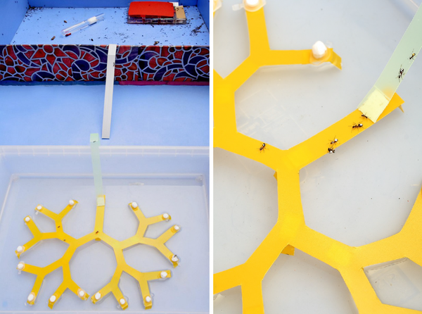 Слева — экспериментальная установка. Видны гнездо и ванна с лабиринтом типа бинарное дерево. Справа — крупный план лабиринта и кормушки. Источники: Reznikova, Ryabko, 1994, Mem. Zool.; Reznikova, Ryabko, 2011, Behaviour; Reznikova, 2008, Myrmecological News.