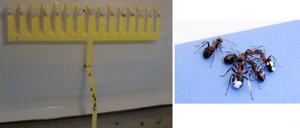 Муравьи разведчики способны запоминать путь к пище через лабиринт и передавать эту информацию фуражирам. Фуражиры, пообщавшись с разведчиком, сразу следуют к нужной «веточке» с кормушкой. Дабы избежать использования запахового следа, сразу после обследования лабиринта разведчиком, лабиринт заменяют точно таким же. Слева — счётный лабиринт, справа — разведчик общается с группой фуражиров. Источники: Reznikova, Ryabko, 1994, Mem. Zool.; Reznikova, Ryabko, 2011, Behaviour; Reznikova, 2008, Myrmecological News.