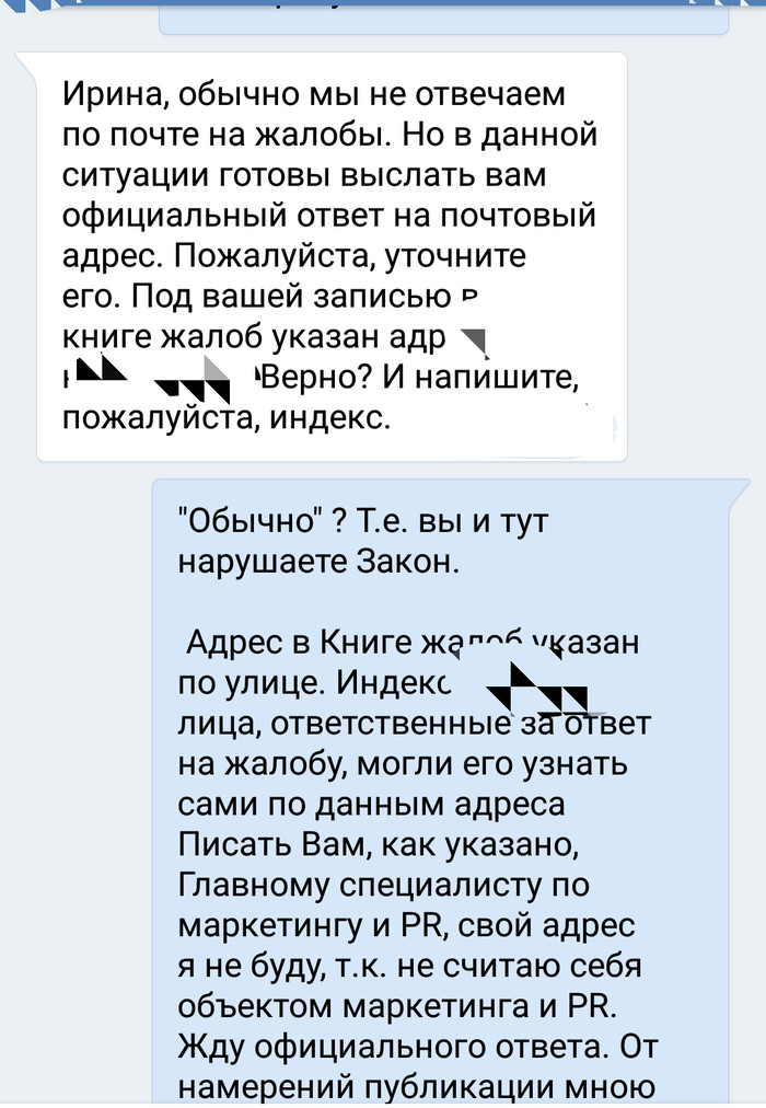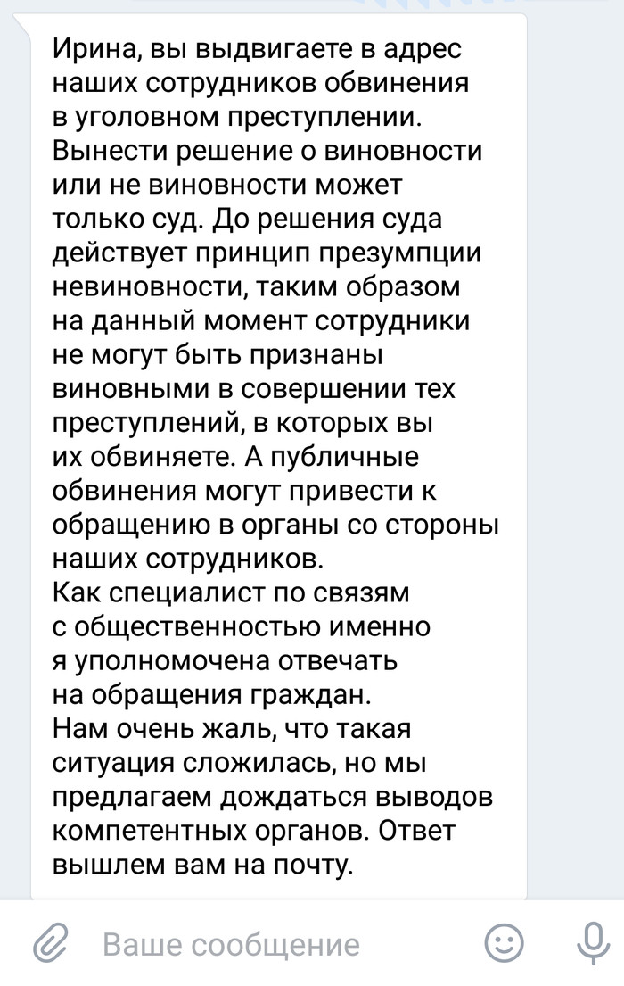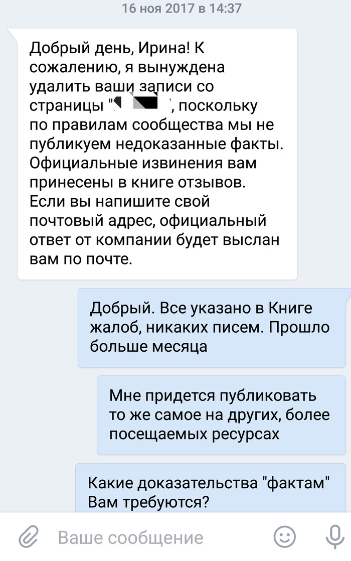 Пишу в их оф.группу в ВК в тему для обсуждений с названием "Общение покупателей" с предупреждением к родителям, чтобы обучили детей как поступать им если их обвиняют и обыскивают, и что в этом магазине, как оказалось это обычное дело. Пост был удален, а личку мне написала некая главный специалист по маркетингу и PR, как было указано в контактах сообщества от магазина: