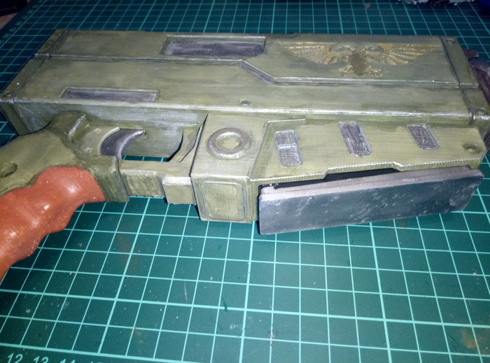 Дальше добавил металлика на грани, покрасил рукоятку и магазин, Добавил несколько деталей, чтобы выглядело по-орочьи - рога, цепь. Губкой натыкал немного ржавчины на шашечки и немного по корпусу.