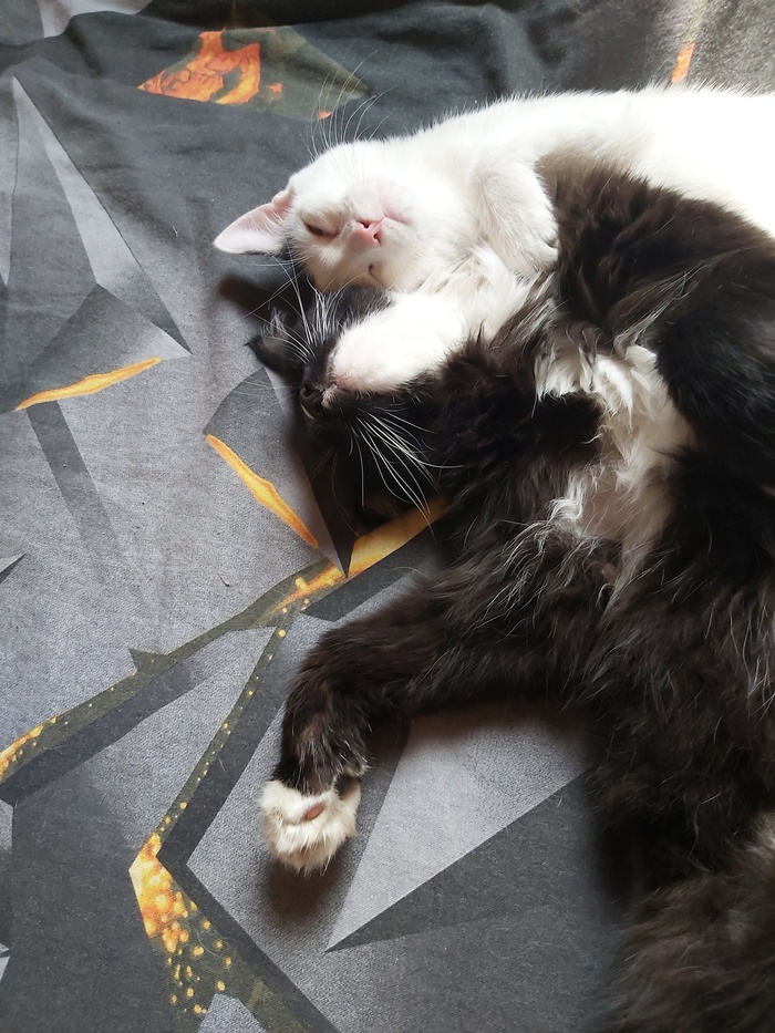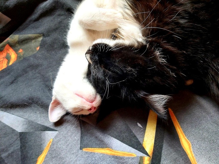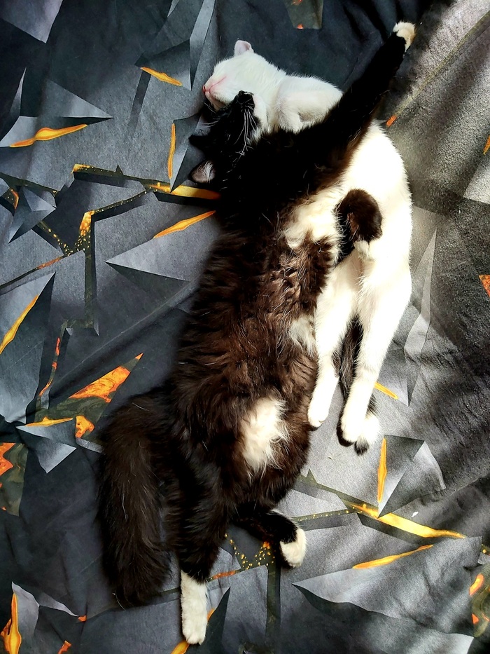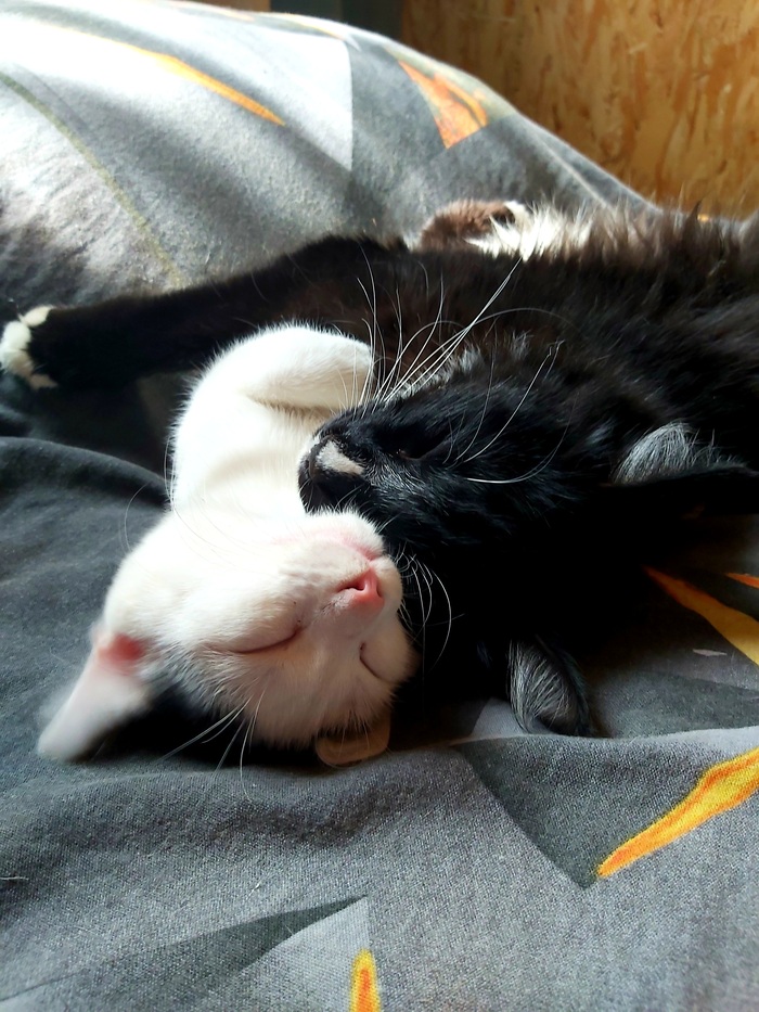 Оба подобрыша, черный "Бумер", кинулся мне под колеса чуть более года назад. Назван из за машины под которую он бросился и будучи за рулем я чуть инфаркт не получила. Второй найденыш. Бухляш зовут, только из за того что когда он просыпается похож на сильно пьющего кота. Оба не особо друг друга любят. Но их обьединяет сон и нелюбовь к собаке.