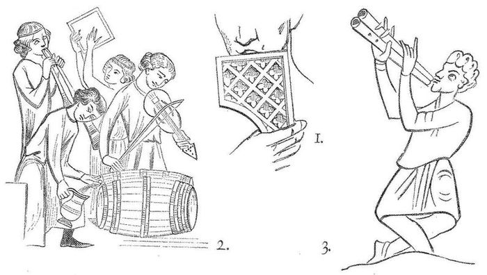 Сама же флейта до 13 века была двойной, как на третьем рисунке миниатюры, причем трубки могут быть как одинаковой, так и разной длины. Количество отверстий на стволе флейты могло варьироваться варьировалось до семи. Играли на флейтах обычно менестрели, жонглеры, причем зачастую их игра предваряла появление торжественной процессии или какого-нибудь высокопоставленного лица.