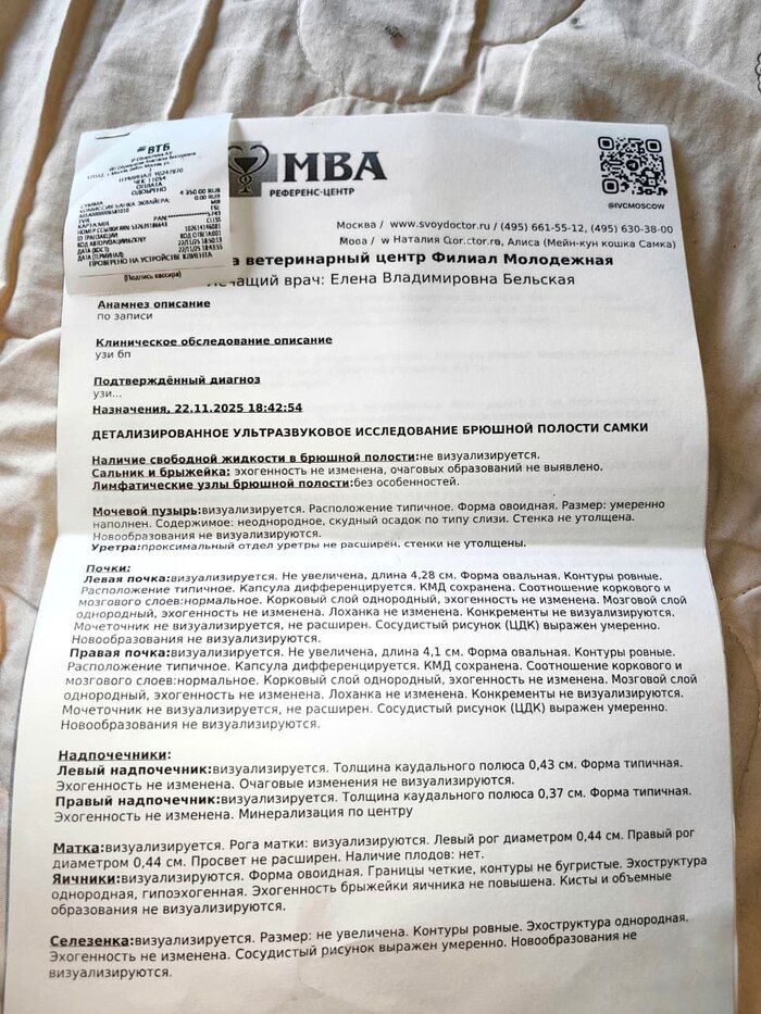 Алиса на узи вела себя максимально спокойно 😴 мы ее держали для приличия, ассиссент за задние лапы, я за передние, а Алиса спокойно лежала, под конец вообще так расслабилась, что балдёжно вытянула все лапы ..))