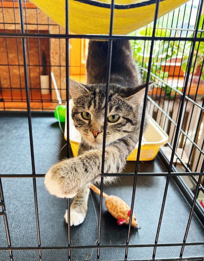 Тусе около 1 года, она очень ласковая, любит внимание, отзывается в ответ на разговоры с ней, бесконечно крутится в клетке, играется, и всячески пытается обратить на себя внимание.