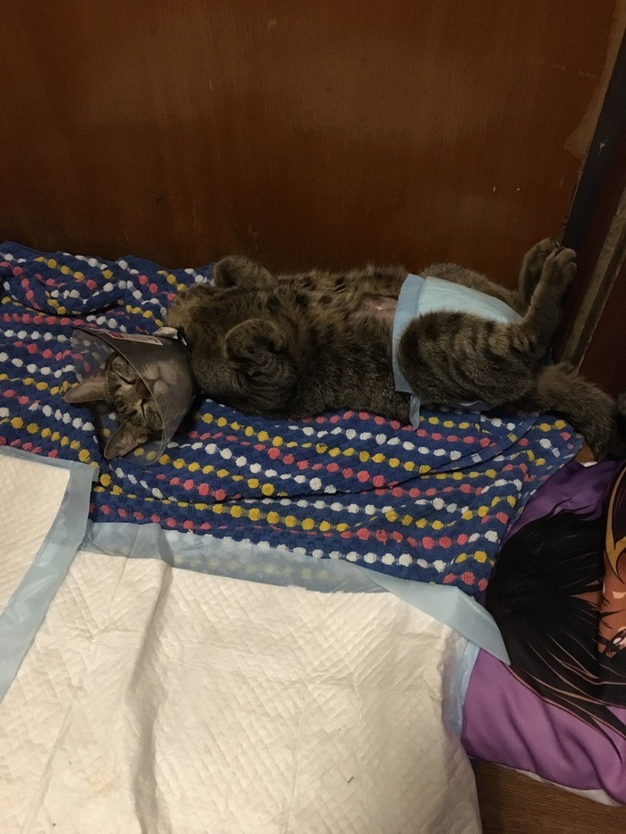 Все время после операции кот спит, писает и ест. Ведет себя спокойно и неудобств не доставляет.