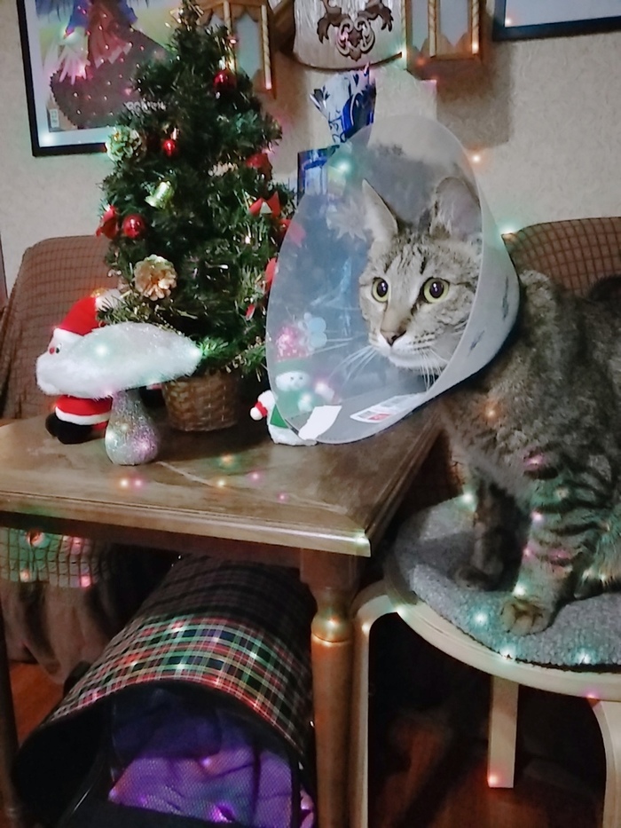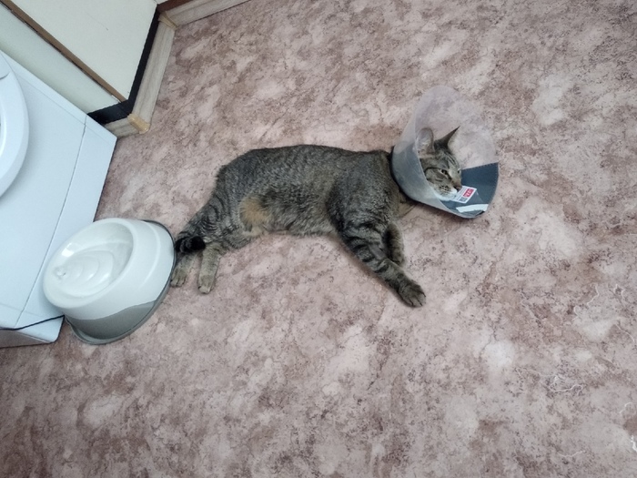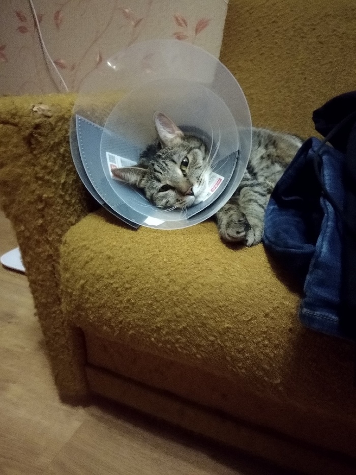 Ну и конечно после операции кот носит воротник. 12 дней до снятия швов, и после снятия швов еще дня 3 или больше, пока не заживет ранка до конца.