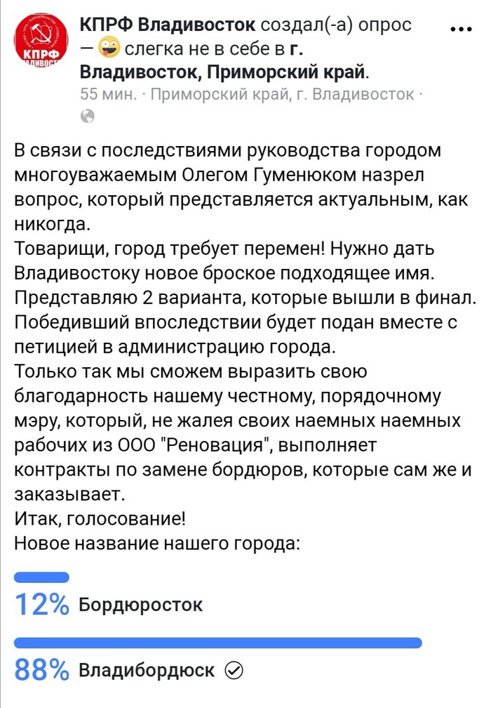 Не обошлось и без участия других политических фракций. Так, на официальной странице КПРФ ВЛ в Фэйсбуке был создан опрос с предложением подать петицию за переименование города.