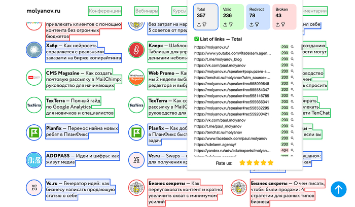 Элементарное в использовании бесплатное расширение для браузера Google Chrome. Этот инструмент незаменим для быстрой проверки посадочных страниц или материалов перед публикацией, будь то статья в блоге, страница каталога или лонгрид. После установки и нажатия на иконку плагин за несколько секунд просканирует все ссылки на открытой странице и наглядно подсветит их разными цветами: