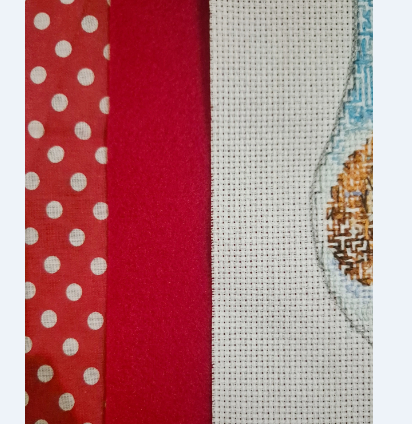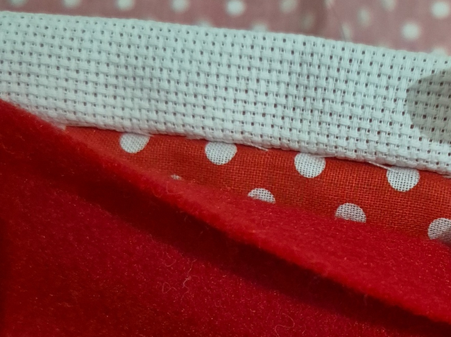 Фетр в подобных наборах обычно идет в комплекте (у Dimensions точно, у других не знаю), но ткань для подкладки нужно в любом случае подыскать самостоятельно. Я взяла хлопковую ткань в цвет, при этом я не закрываю подкладкой фетр, а только изнанку вышивки, поэтому порядок именно такой, как ниже. Изнанка шва после выворачивания окажется между подкладкой и канвой, ее не будет видно.