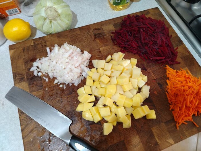 Свеклу тушу отдельно , морковку с луком пассерую, из бульона вынимаю мясо и закладываю картошку. Когда картошка в состоянии полуготовности, отправляю в кастрюлю нашинкованную капусту.