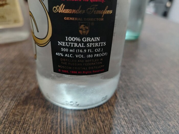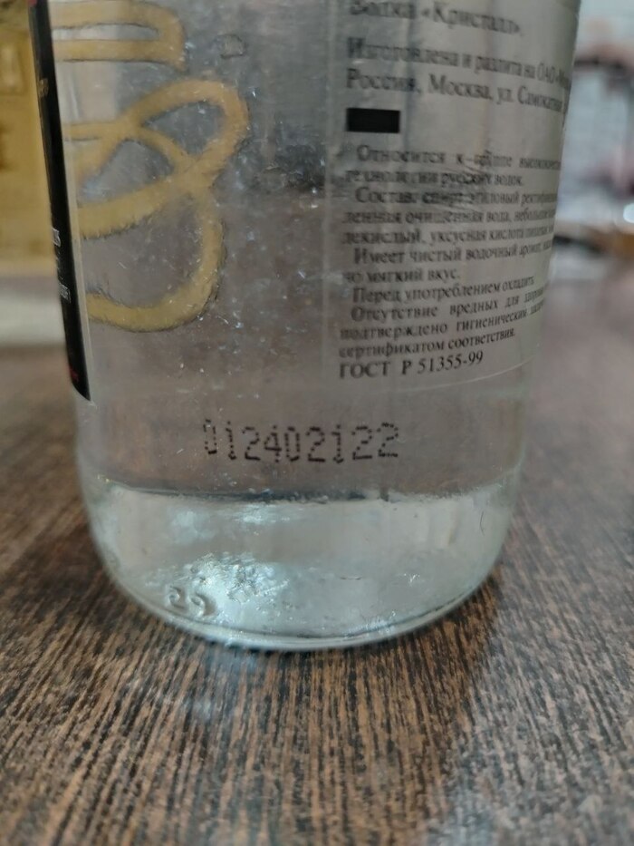 Следующая - водка "Кристалл" от "Московского завода "Кристалл". Найти достоверно дату производства не удалось, но на этикетке все права защищены в 95-96 годах, а по цифровому обозначению, если я правильно прочитал, 24.02.2001. Но с этим сложно, поправьте, если ошибаюсь. Ее объем - 0, 41 л, а крепость составила всего 26°. Прозрачная, без примесей.