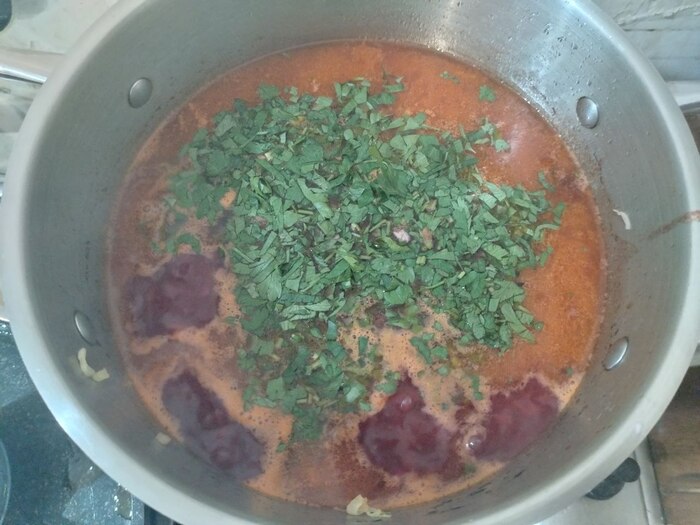 Нарезаю зелень, нарезаю мясо. Перед закладкой свеклы выдавливаю в кастрюлю сок половины лимона. Все смешиваю, 10 минут, варить, полчаса ждать.