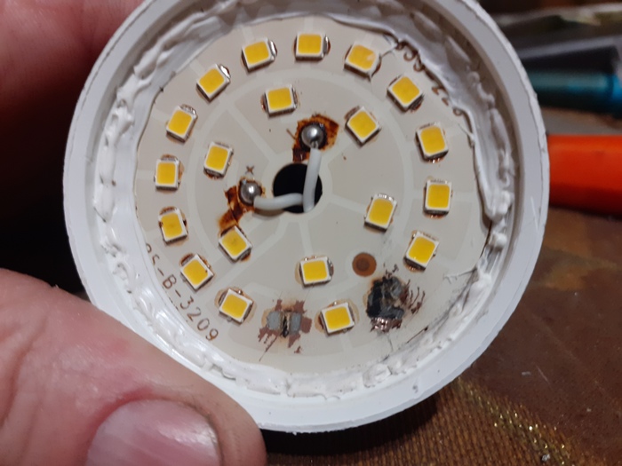 Видно, что 2 светодиода сгорели, их нужно удалить. Я использую канцлерский нож, просто грубо сковыриваю старые диоды.