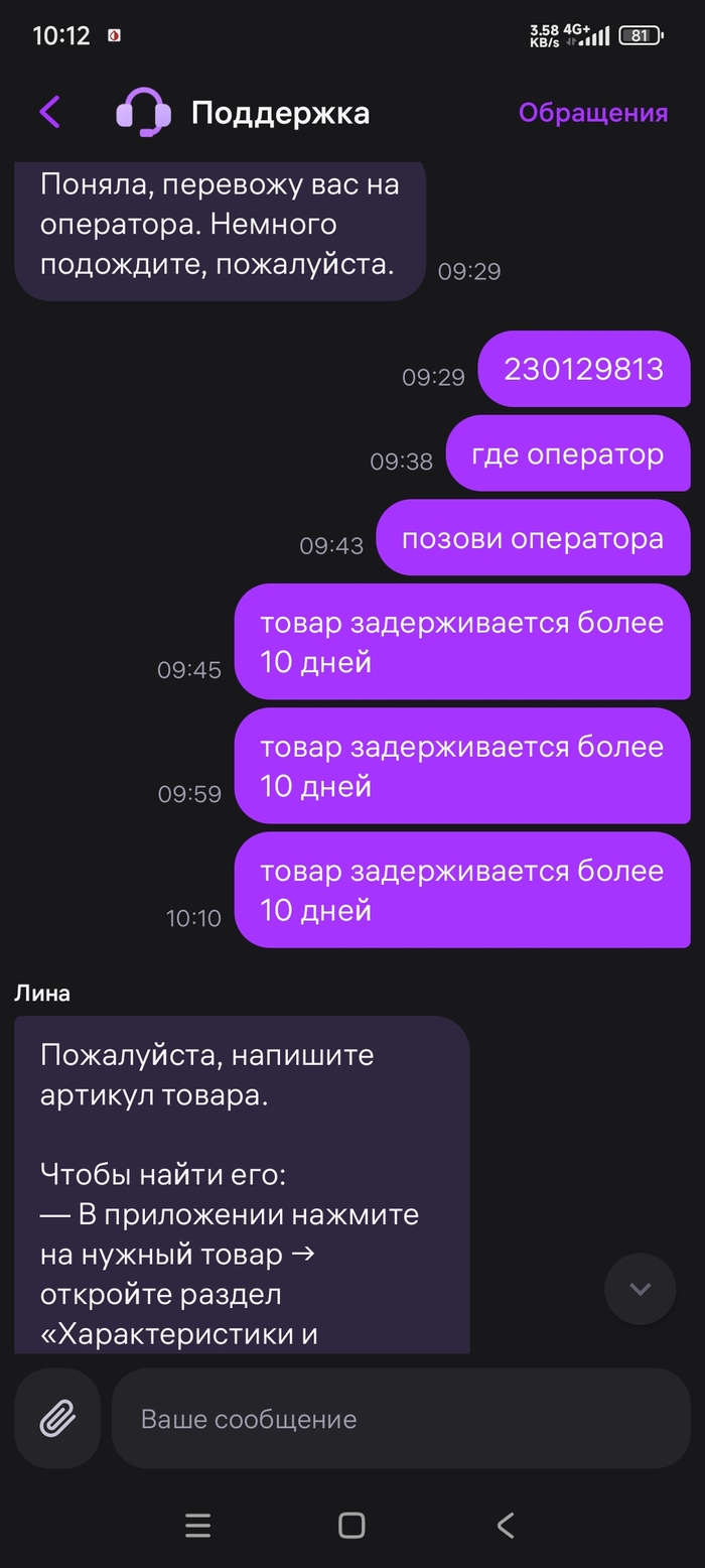 Что делает в это время поддержка Wildberries, которой я пишу, что "продавец меня обманывает", "позови оператора" и в том же духе? Да ничего, она всё ещё не отвечает на сообщения и притворяется опоссумом. То есть на сегодня 27.08 уже 21 день поддержка мне не отвечает - я ни разу не видела живого оператора. Это просто дно дна.