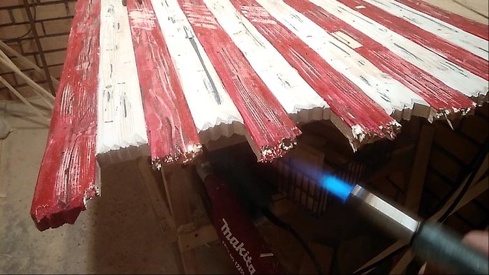 Расставляем все кубики дуба на верстаке, шлифуем и проходим морилкой тёмные элементы.