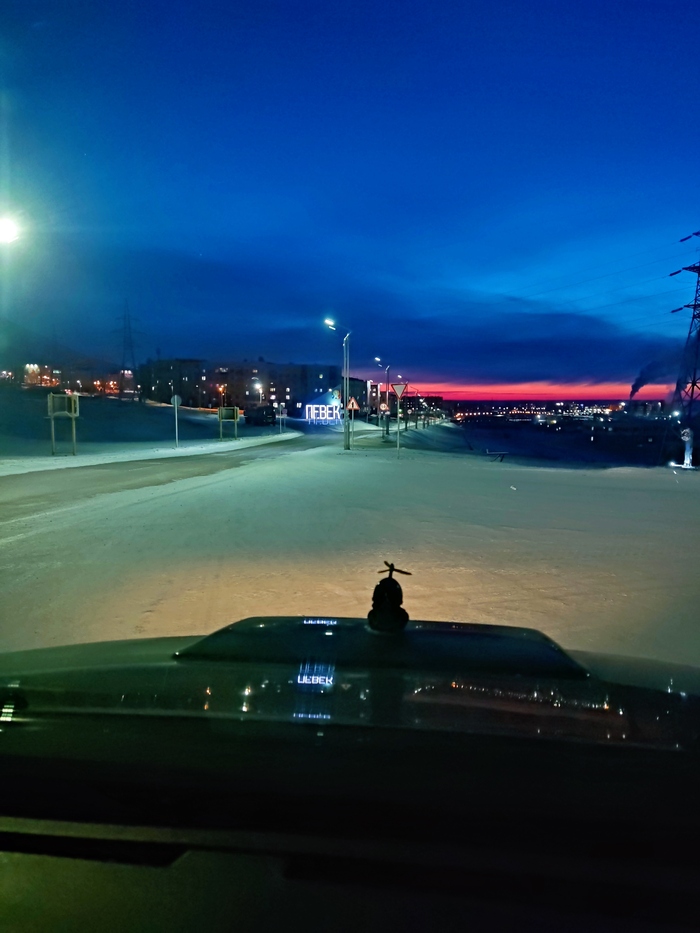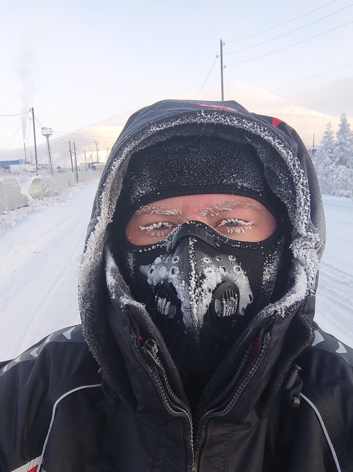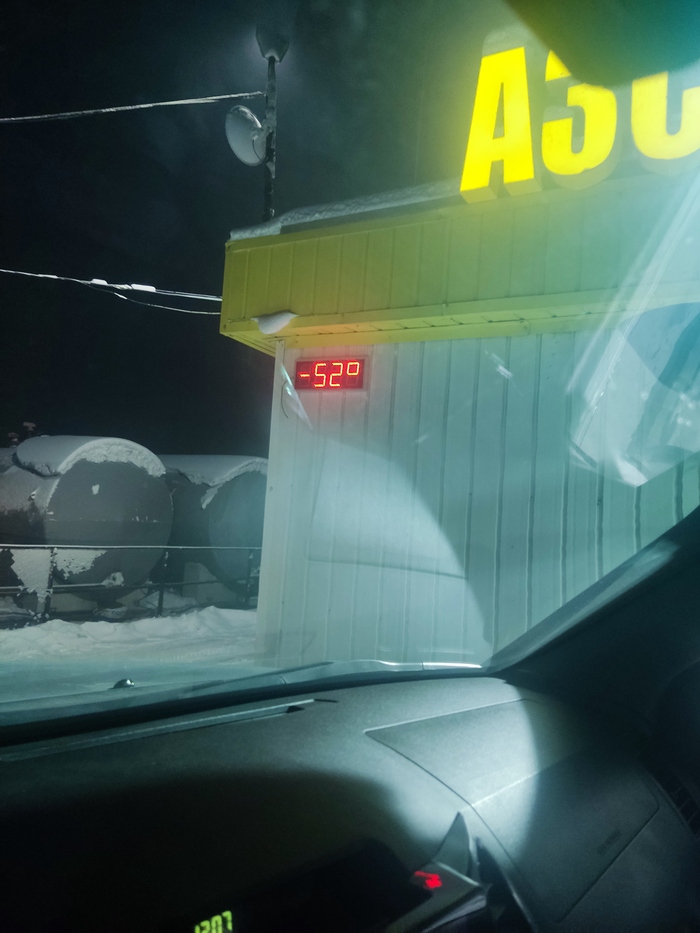 Минимум температуры на фото, который удалось зафиксировать -52 градуса в 22.00. Под утро по словам местных было -57 градусов. Оказывается при такой температуре можно жить. Дорога от жилья до СТО Андрея занимала около часа пути.